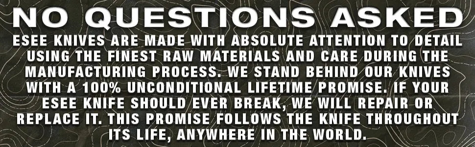 All ESEE knives are made with absolute attention to detail using the finest raw materials and care during the manufacturing process, and ESEE stands behind its knives with a 100% unconditional lifetime guarantee. If your ESEE knife should ever break (even because of typical knife-no-nos like throwing or prying), ESEE will repair or replace it. This warranty follows the knife throughout its life, anywhere in the world. No sales receipt or warranty registration required.