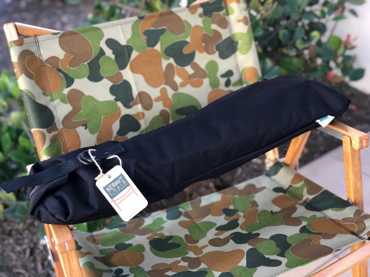 Every Kermit Chair comes standard with a 1000-dernier black nylon transport bag with carry strap that is only 22" x 4" x 6" in loaded dimensions. The Kermit Chair can be quickly and easily disassembled and packed in the transport bag or it can be left assembled and folded flat and be transported briefcase style.